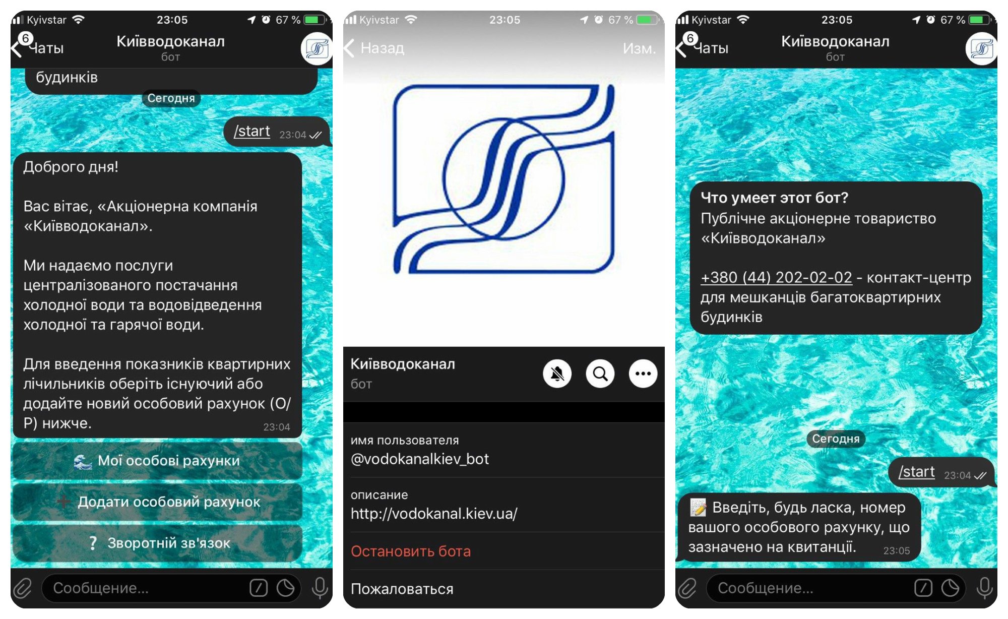 Невероятно, но факт: передать показания счетчиков тоже можно через Telegram-бота. В частности такой создал «Киевводоканал». Как им воспользоваться? Нажать «start», добавить номер лицевого счета и ввести все необходимые данные.