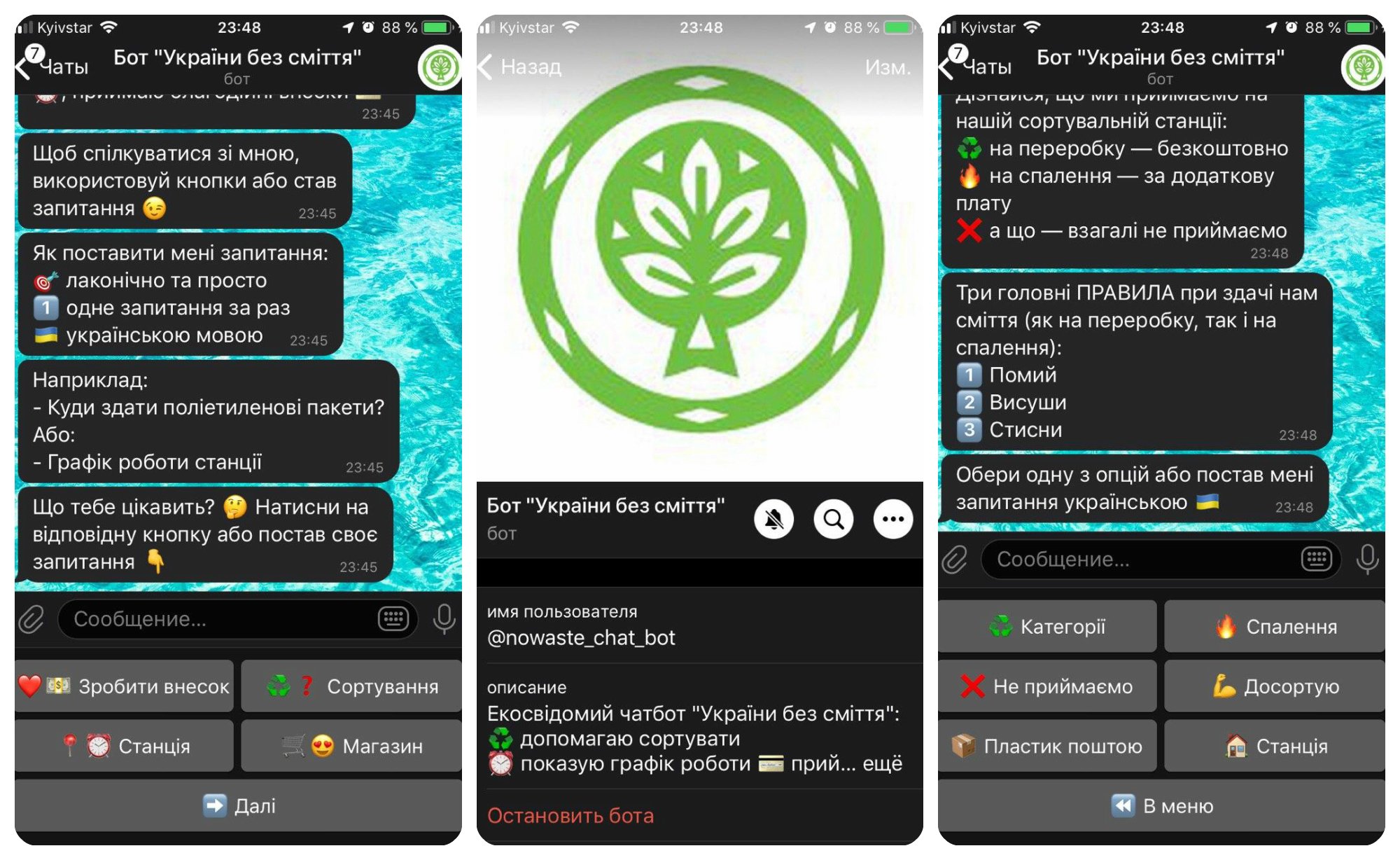 Еще один крайне полезный бот: экосознательный бот организации «Україна без сміття» по имени Сортун. Его разработали студенты КПИ, чтобы помочь горожанам сортировать мусор.