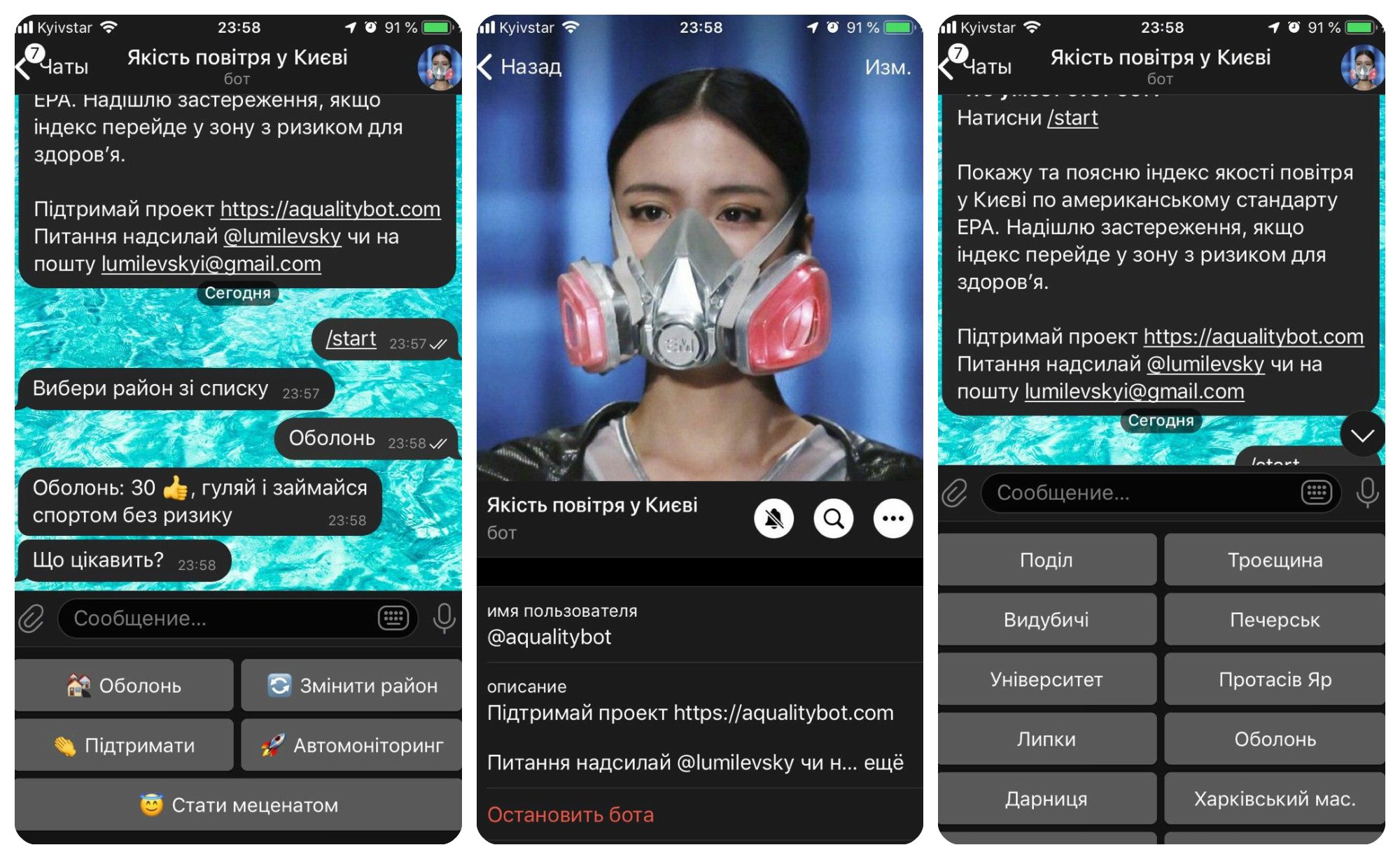 Чат-бот, который следит за качеством воздуха в Киеве и предупреждает, если она резко ухудшилась, после очередного смога в 2018-м создал киевский разработчик Любомир Милевский.