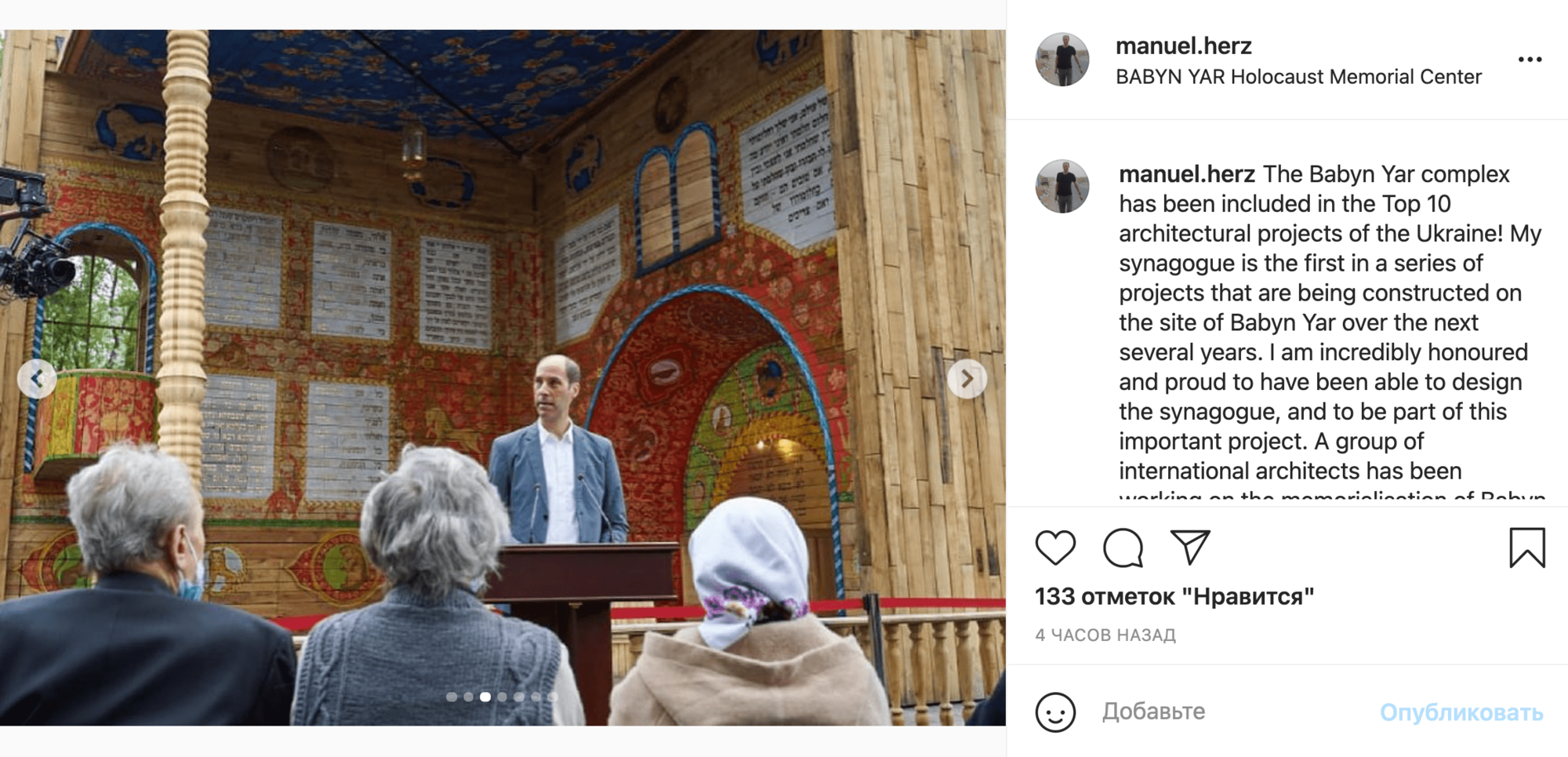 «Моя синагога стала первой из серии объектов, которые будут возведены в Бабьем Яру в течение следующих нескольких лет. Этой весной, кто не знает, вместе с командой Мемориального центра Холокоста мы представили в урочище символическую синагогу – «Место для размышлений». Горжусь, что имел возможность спроектировать её и стать частью этой команды. В целом же строительство Мемориального комплекса в Бабьем Яру продлится как минимум до 2026 года. Уже осенью этого года в Бабьем Яру появятся не менее удивительные объекты. К работе над пространством присоединится ещё немало талантливых и известных на весь мир архитекторов. Уверен, что мемориализация Бабьего Яра ещё больше усилит культурное значение украинской столицы в мировой истории», – отметил он.