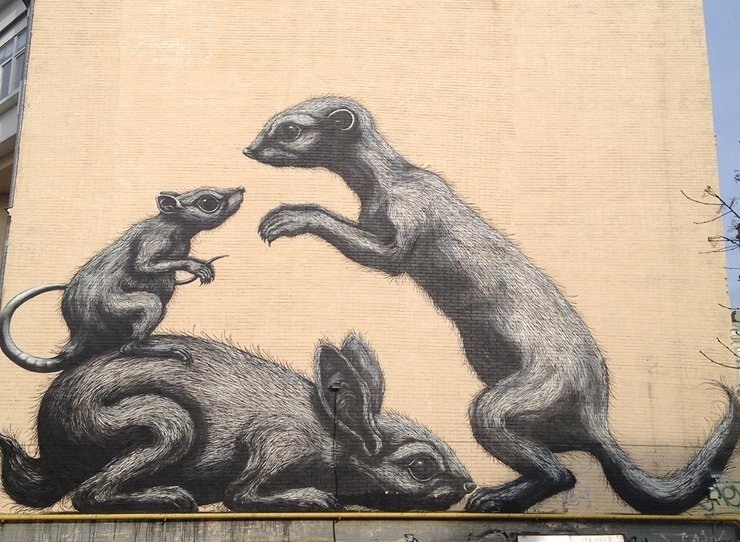 На стене шестиэтажного дома, что на улице Олеся Гончара, можно увидеть необычную троицу — крысу, мангуста и кролика. Графических животных нарисовал бельгийский стрит-арт художник ROA. Художник создал мурал в рамках арт-проекта Art United Us и закончил работу над творением в срок, несмотря на проблемы со здоровьем.