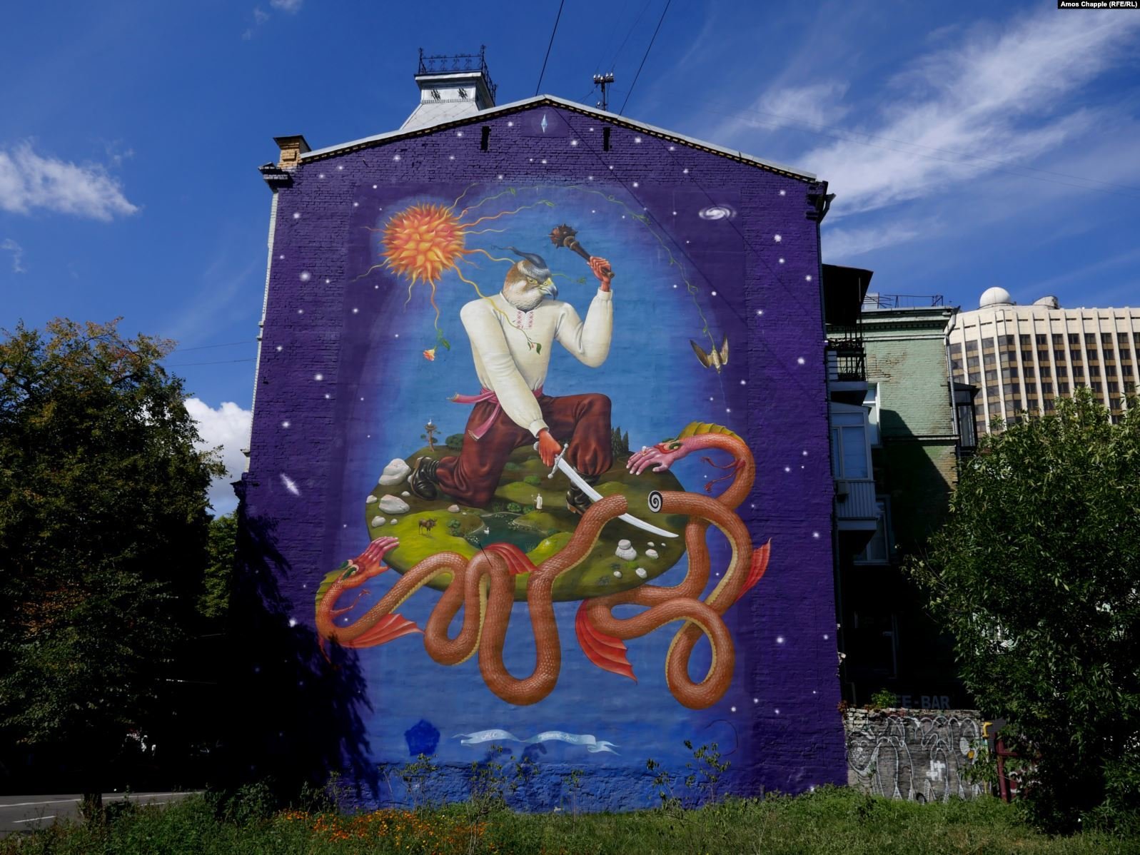 Патриотический мурал под названием "Украинский Святой Георгий" создала целая команда украинских уличных художников под руководством Владимира Манжоса, известного под псевдонимом Interesni Kazki, и Алексея Бордусова. Рисунок с казаком, который разрубает змея пополам, появился в столице в октябре 2014-го, накануне судьбоносных для Украины событий.