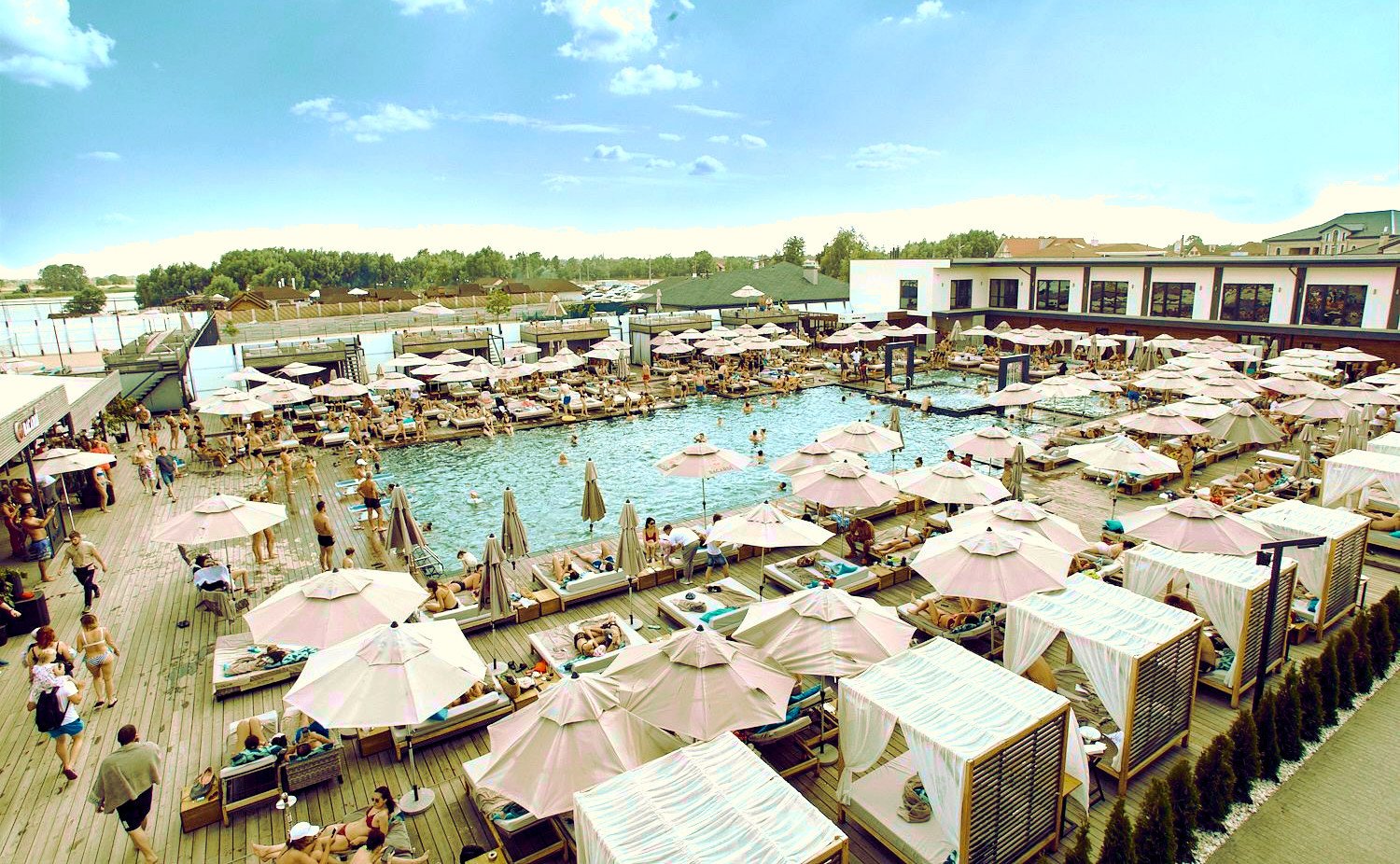 Открытая в мае этого года огромная локация на левобережье сочетает в себе огромный бассейн, пляж, панорамный ресторан, видовую террасу, зону BBQ, отель, банный комплекс и просторный коттедж.