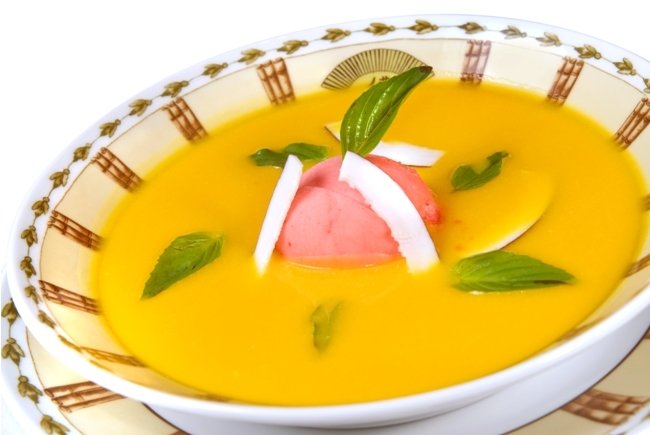 Этот супчик на самом деле вовсе не первое блюдо. Это фирменный десерт "Buddha-bar", который включает в себя целый калейдоскоп фруктовых вкусов (сладость манго, кокосовое райское наслаждение и кислинка ягодного сорбета). Если, придя сюда, вам захотелось сладкого, обязательно выбирайте этот суп-десерт. Точно не прогадаете!