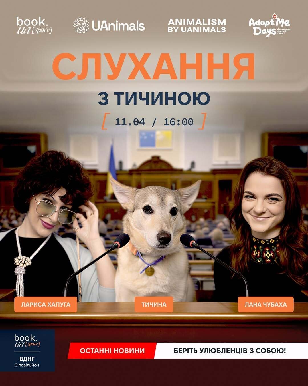Add to calendarAt book.ua space at VDNH, the event “Listening with Tychyna” will take place — a comedic public talk about pet adoption, where the moderator’s role will be given to a dog named Tychyna.
