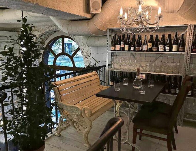 The interior, designed by Alyona Bondar, channels old Roman eateries — with warm tones, faded textures, uneven tiles, and minimalist but quirky decor.