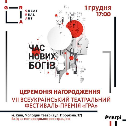 Add to calendar1 декабря в Молодом театре (г. Киев, ул. Прорезная, 17) состоится финальный аккорд 7 Всеукраинского театрального фестиваля-премии "ГРА" – церемония награждения лауреатов. Если хотите одними из первых узнать имена победителей, приглашаем стать зрителем/зрительницей торжественной церемонии.