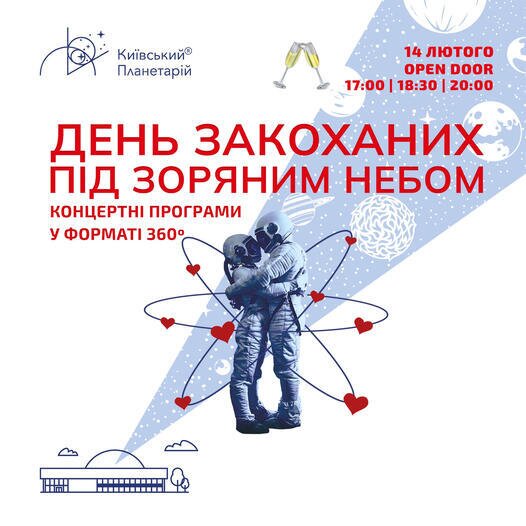 Add to calendar14 февраля Киевский Планетарий станет местом, где откроется таинственный и желанный портал любви, а романтическое свидание под звездами превратится в настоящее чудо в любую погоду. Неземная волна этого невероятного чувства подхватит каждого, подарит невероятные впечатления и позволит на пару часов отвлечься от тяжелых мыслей.