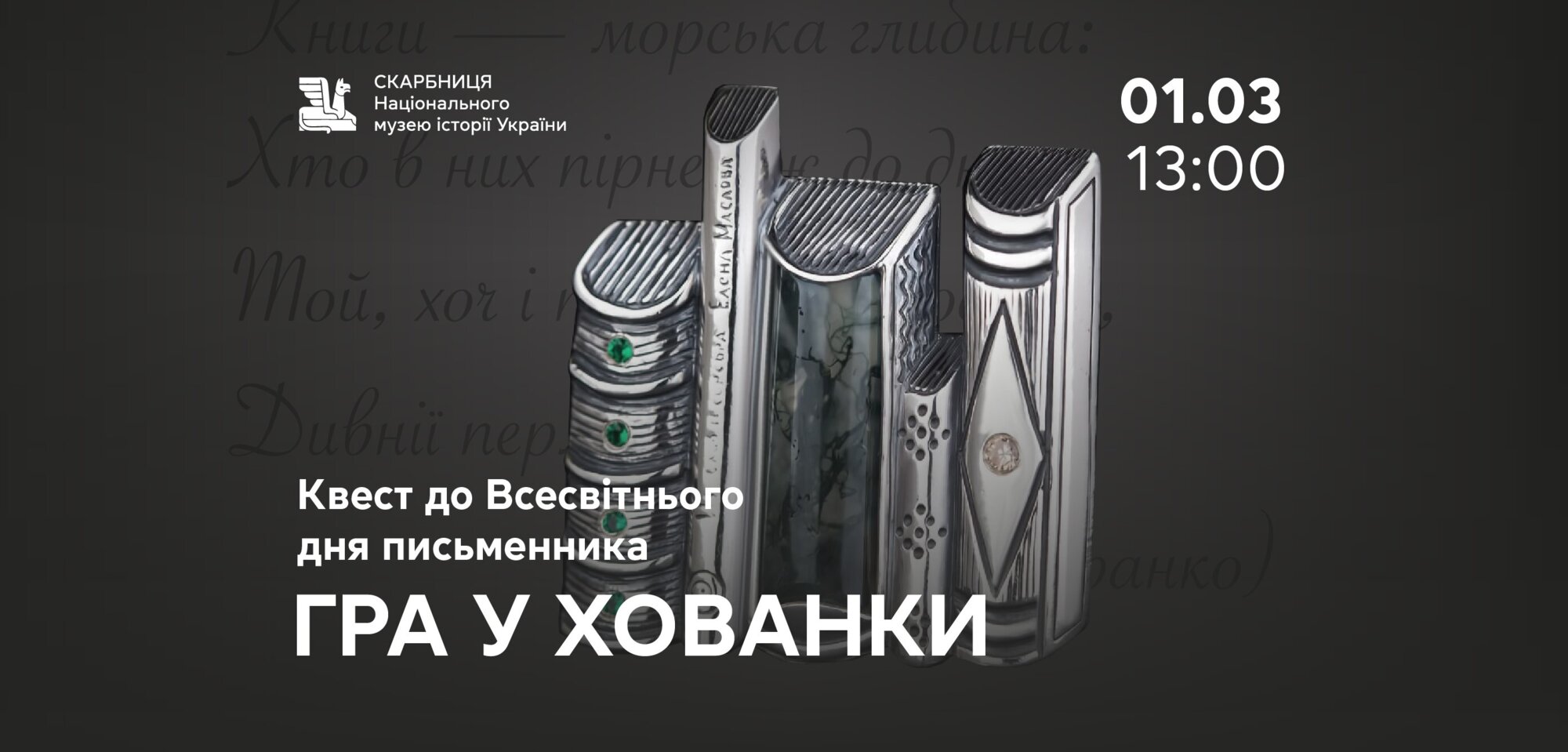 Add to calendarСподіваємося, ви із задоволенням читаєте художні книги і любите поезію. Якщо так, тоді у вас точно вийде зіграти в хованки ... з експонатами «Скарбниці Національного музею історії України».
