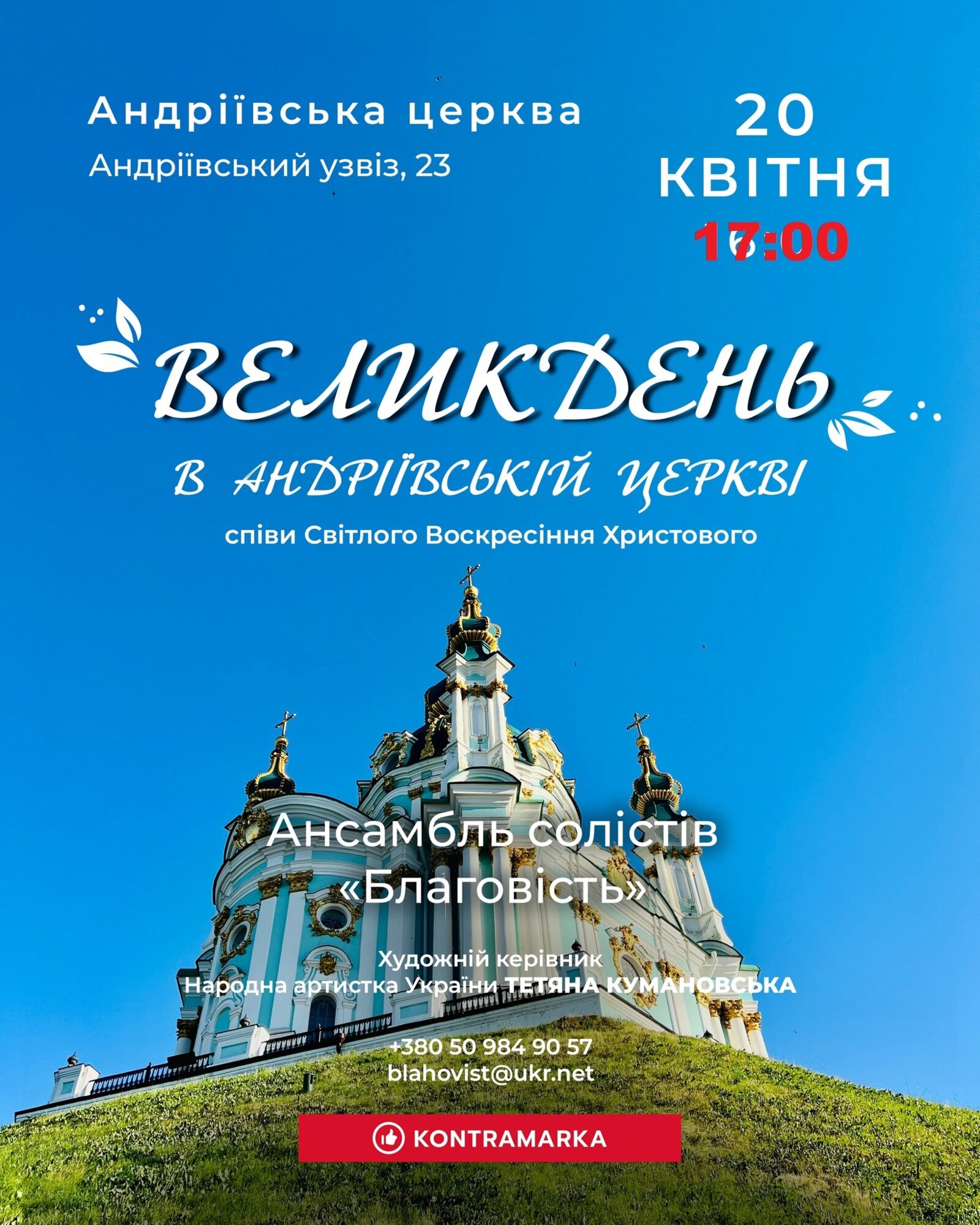 Add to calendarВідчуємо радісний настрій величного Свята Воскресіння Христового в чарівних інтер’єрах Андріївської церкви під звуки всесвітньовідомих творів геніальних українських композиторів Д.Бортнянського, М.Березовського, А.Веделя, М.Лисенка, К.Стеценка, М.Леонтовича, М.Вербицького, у неперевершеному виконанні співаків Ансамблю солістів «Благовість».