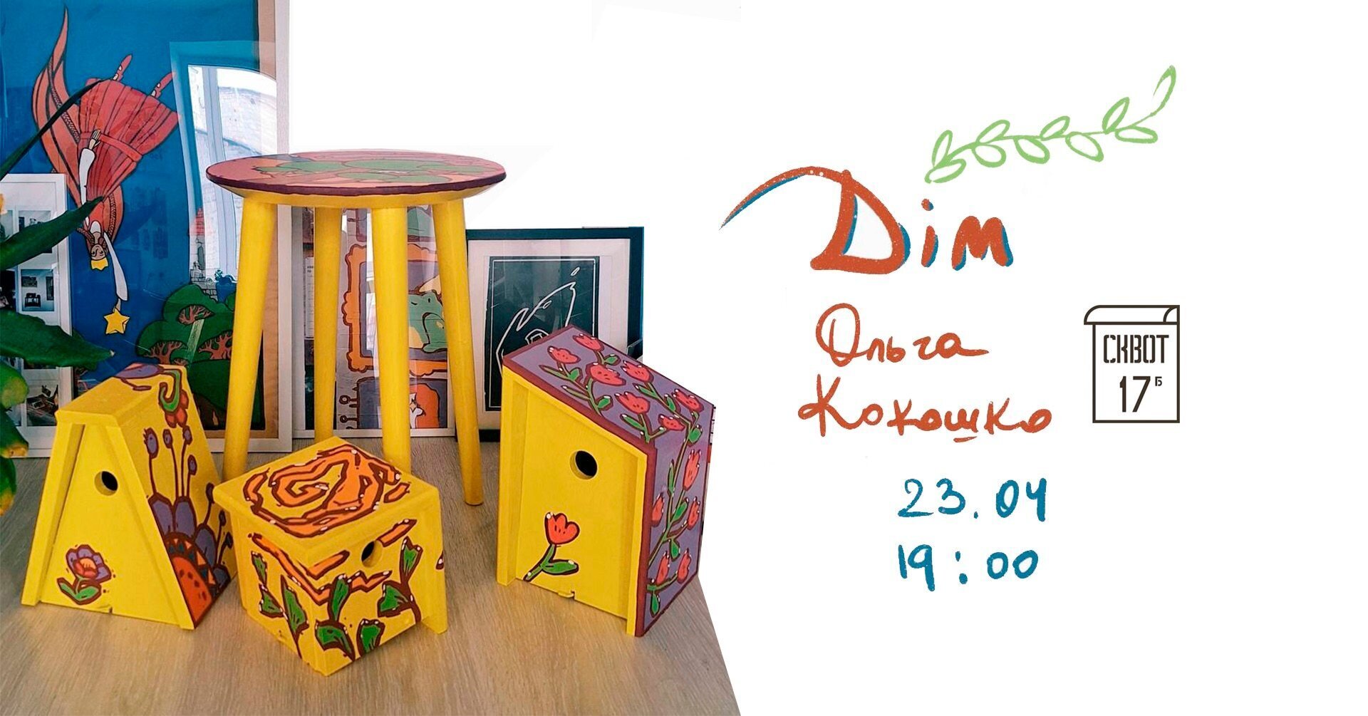 Ольга Кокошко — авторка частини візуальної ідентичності простору Squat 17b, адже саме вона розписала меблі літнього майданчику, паркан й навіть не один, та деякі стіни Сквоту.