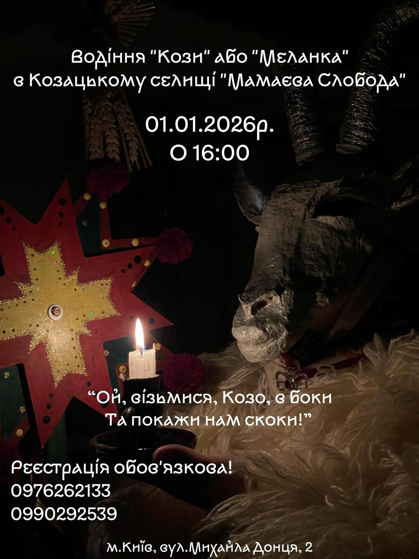 Add to calendarВодіння «Кози» або «Меланка» - «Мамаєва Слобода» запрошує на відтворення давнього дійства!