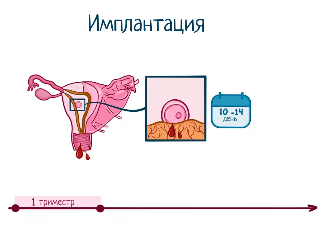 Запліднення відбувається в матковій трубі, де яйцеклітина зустрічається зі сперматозоїдами. Тоді запліднена яйцеклітина кілька діб спускається трубою в матку. Весь цей час клітини діляться, тож коли вона досягає матки, перетворюється на ембріон. Наступна стадія — імплантація ембріона до ендометрію, тобто закріплення його у матці. Ендометрій, якій вистилає матку зсередини, на момент імплантації стає товстим, складчастим і пухким, створюючи оптимальне середовище для ембріона. Коли ембріон імплантується, може порушити його цілісність, через що відбувається невелика кровотеча. Вона називається імплантаційною.