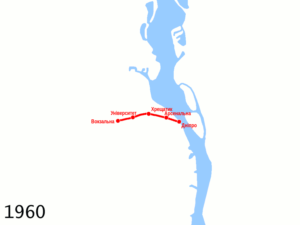 Історія київського метрополітену починається з 1884 року, коли вперше виникла ідея підземної залізниці в місті. Однак підготовчі роботи почалися лише в 1938 році. Утім їх перервала війна і до ідеї повернулися лише в 1944 році, а будівництво розпочалося у 1949-му. У 1958 році серед 80 проєктів станцій обрали 5 найкращих і вже у листопаді 1960 року запрацювала перша ділянка червоної гілки із станціями «Вокзальна», «Університет», «Хрещатик», «Арсенальна» та «Дніпро» загальною протяжністю 5,2 км. Розбудова гілки закінчилася в 2003 році відкриттям станцій «Житомирська» та «Академмістечко».