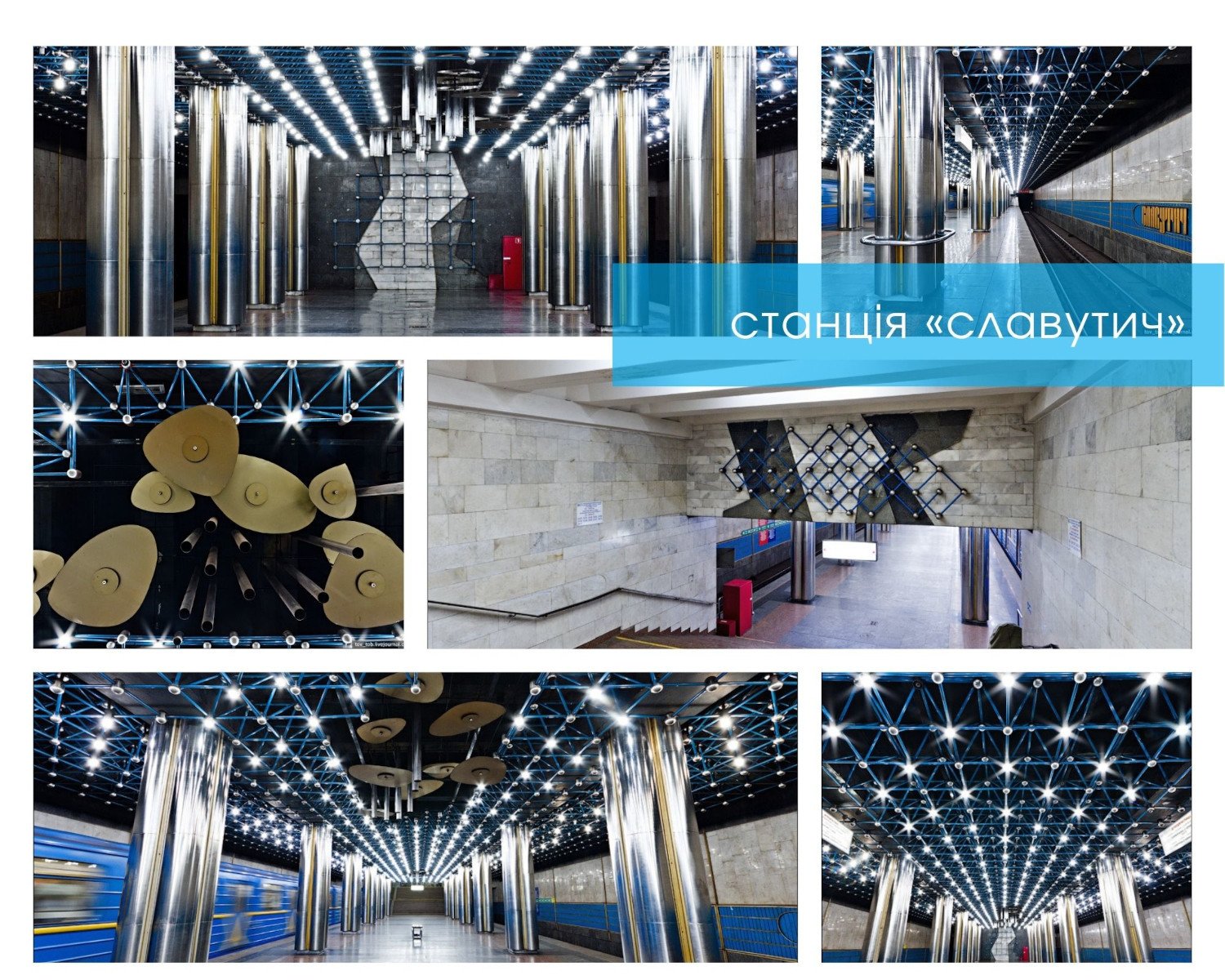 Станція «Славутич» виконана з білого і синього мармуру з маленькими світильниками і алюмінієвими конструкціями у вигляді лілій на чорній стелі. За задумом архітектора Альошкіна вона має нагадувати ніч над Дніпром. А на боковій стіні бачимо ще композицію, що зображає русло річки.