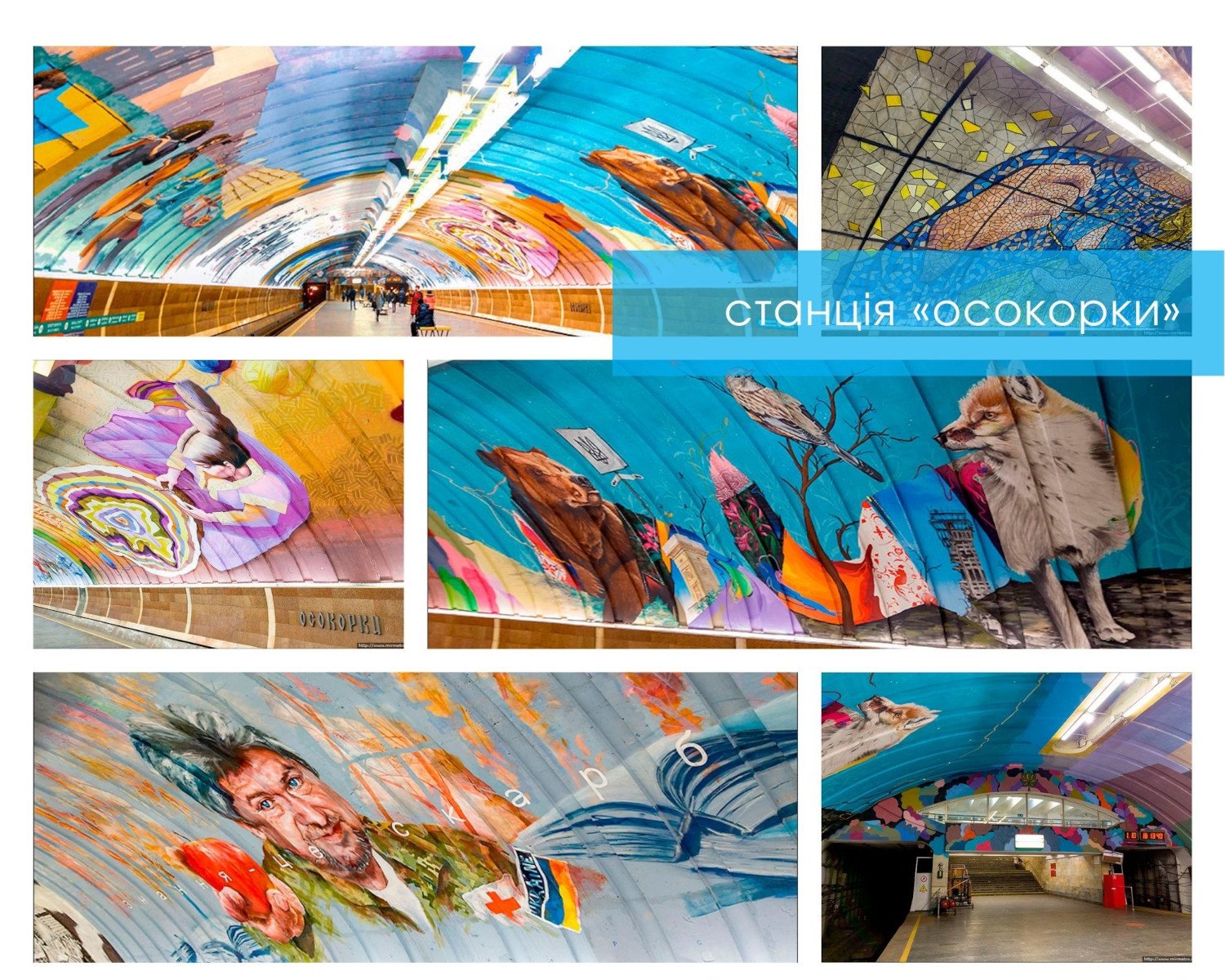 Осокорки стала першою односклепінною станцією на зеленій гілці. Раніше на платформі були встановлені фонтанчики у вигляді каменів, але на початку 2000-х їх демонтували. Натомість у 2018 у межах проєкту «More than us» вестибюль станції прикрасили муралами восьми світових художників. На малюнках зображено червонокнижних тварин, татарську дівчину з квітами, актора Богдана Ступку тощо.