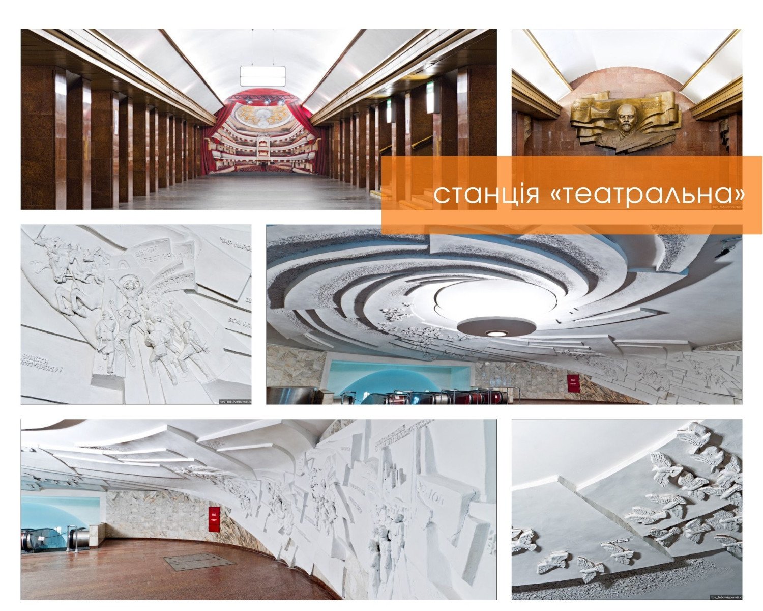 Раніше станція називалася «Ленінською» і була оздоблена таким самим червоним мармуром, що і мавзолей вождя. На стіні розміщувався бюст Володимира Ілліча, який у 2014 році закрили 3D зображенням театральної сцени. Тоді ж зняли і таблички з радянськими гаслами, що були по всій станції. Стелю верхнього вхідного вестибюля прикрашають горельєфи та барельєфи із зображенням подій, що ніби закручуються у спіраль часу.