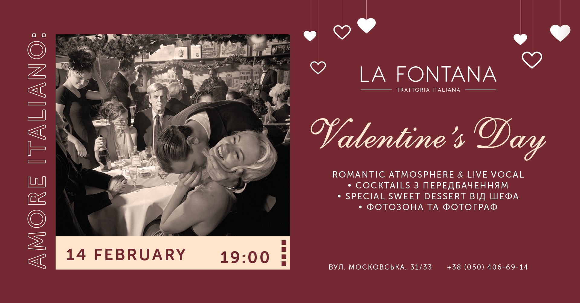 14 лютого La Fontana наповниться пристрасним коханням та романтичною атмосферою — усе, як люблять справжні італійці. Дозвольте піддатись спокусам у День Закоханих. Насолоджуйтесь довершеною вечерею, італійським вином та мелодіями live music.