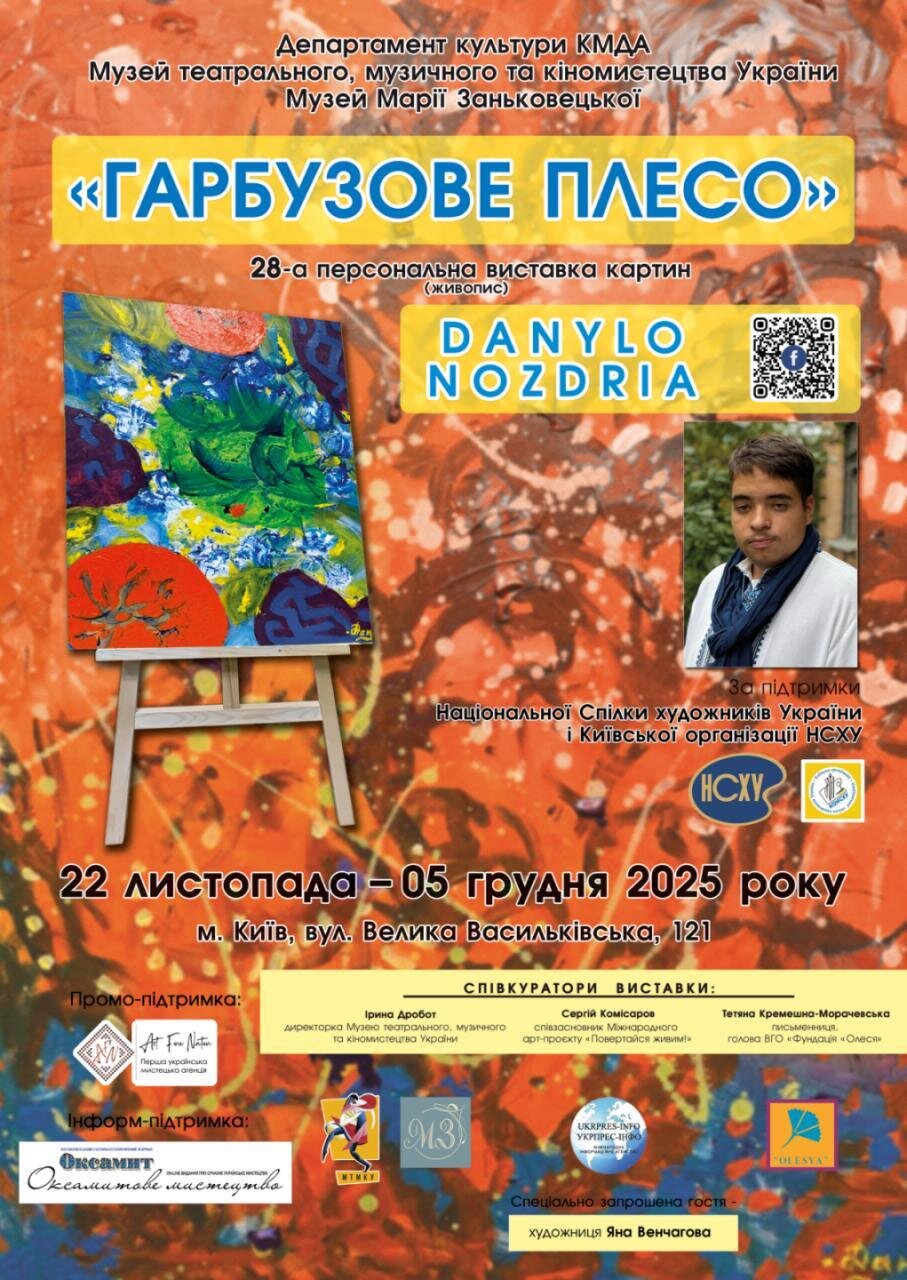 Із 22 листопада по 05 грудня в Музеї Марії Заньковецькоі (філіі Музею театрального, музичного та кіномистецтва України, директорка Ірина Дробот) за підтримки Національної Спілки художників України і Київської організації НСХУ відбуватиметься 28-а персональна виставка картин (живопис) «Гарбузове плесо» 16-річного (але вже добре відомого в Україні та закордоном!) киівського художника-абстракціоніста Danylo Nozdria, наймолодшого члена ОМХМ Національної Спілки художників України, лауреата Національної премії «Скарб нації» (2024).