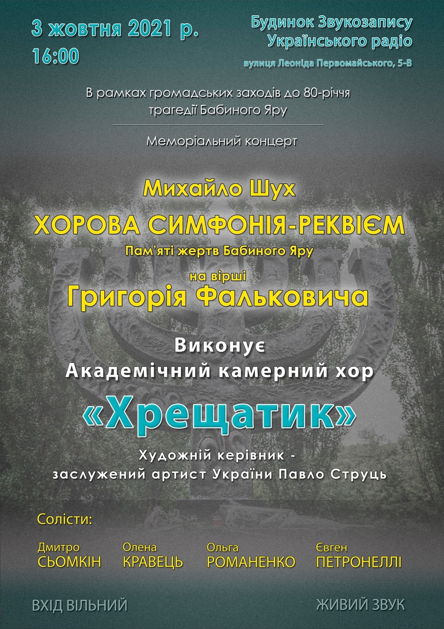 Прозвучить Хорова симфонія-реквієм Михаїла Шуха, на вірші Григорія Фальковича. Твір присвячено пам'яті жертв Бабиного Яру.