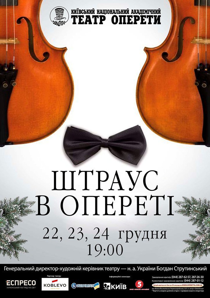 У Київському Національному академічному театрі оперети відбудеться новорічний концерт «Штраус в опереті». Ця неймовірна зустріч з чарівною музикою родини Штраусів стала вже традиційною для киян і гостей міста. Цього вечора прозвучать як і відомі твори композиторів, так і ті, які досі не виконувались в Україні.