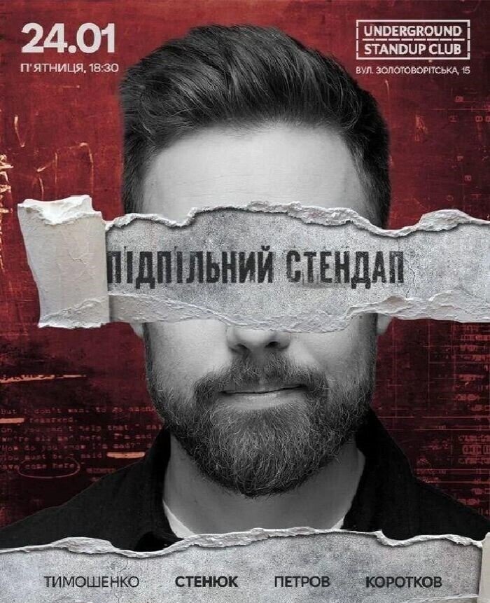 24 січня в легендарному Underground Standup Club на вас чекає вечір справжньої української комедії. На сцені виступатимуть Антон Тимошенко, Антон Стенюк, Артур Петров і Женя Коротков.