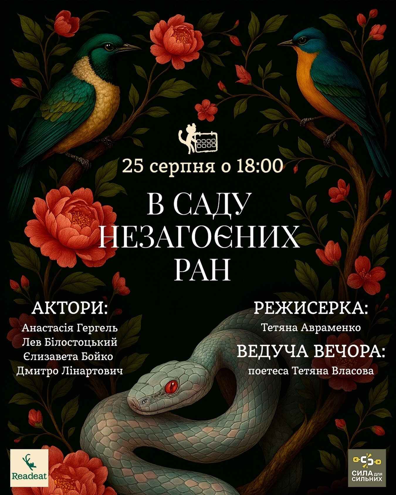 Поетичний перформанс “В саду незагоєних ран” відбудеться 25 серпня у київській книгарні Readeat (вул. Антоновича, 50). Початок о 18.00. Вхід вільний.