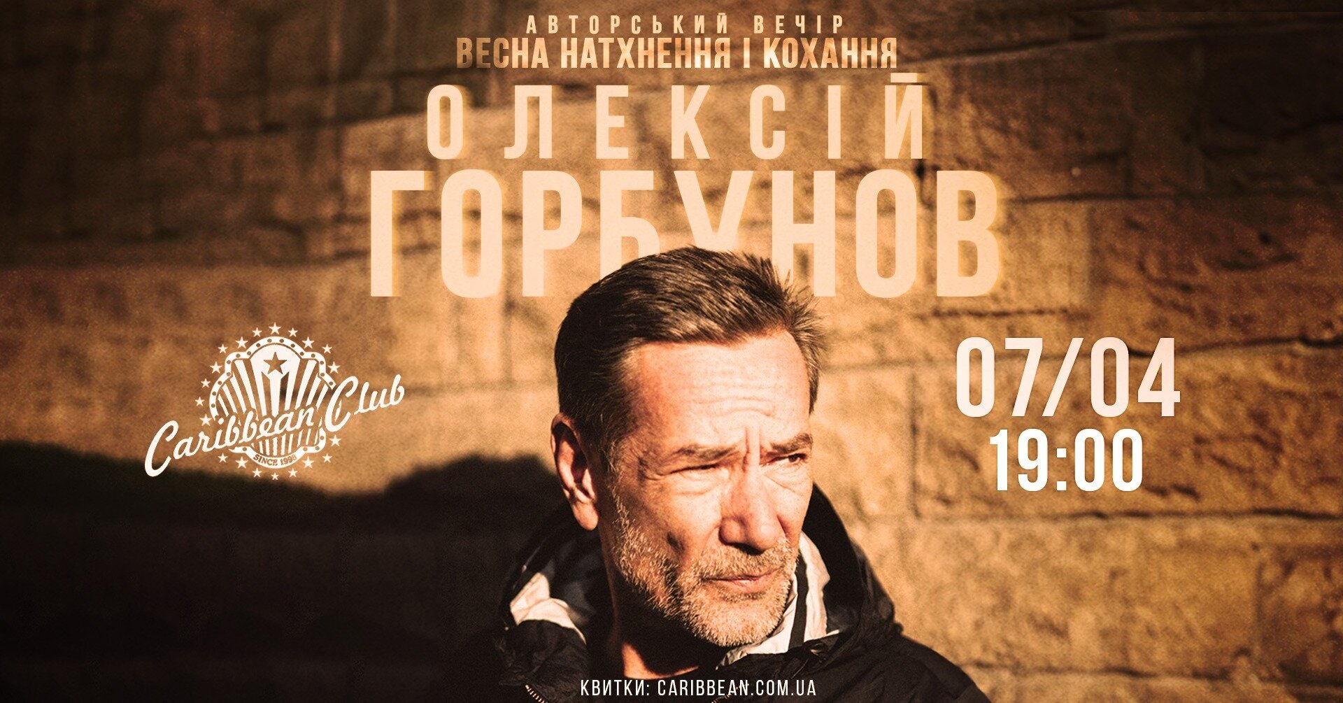 Add to calendar7 квітня творчий вечір талановитого актора, яскравого артиста, харизматичної особистості — виступ Олексія Горбунова у форматі акустичного квартирника!